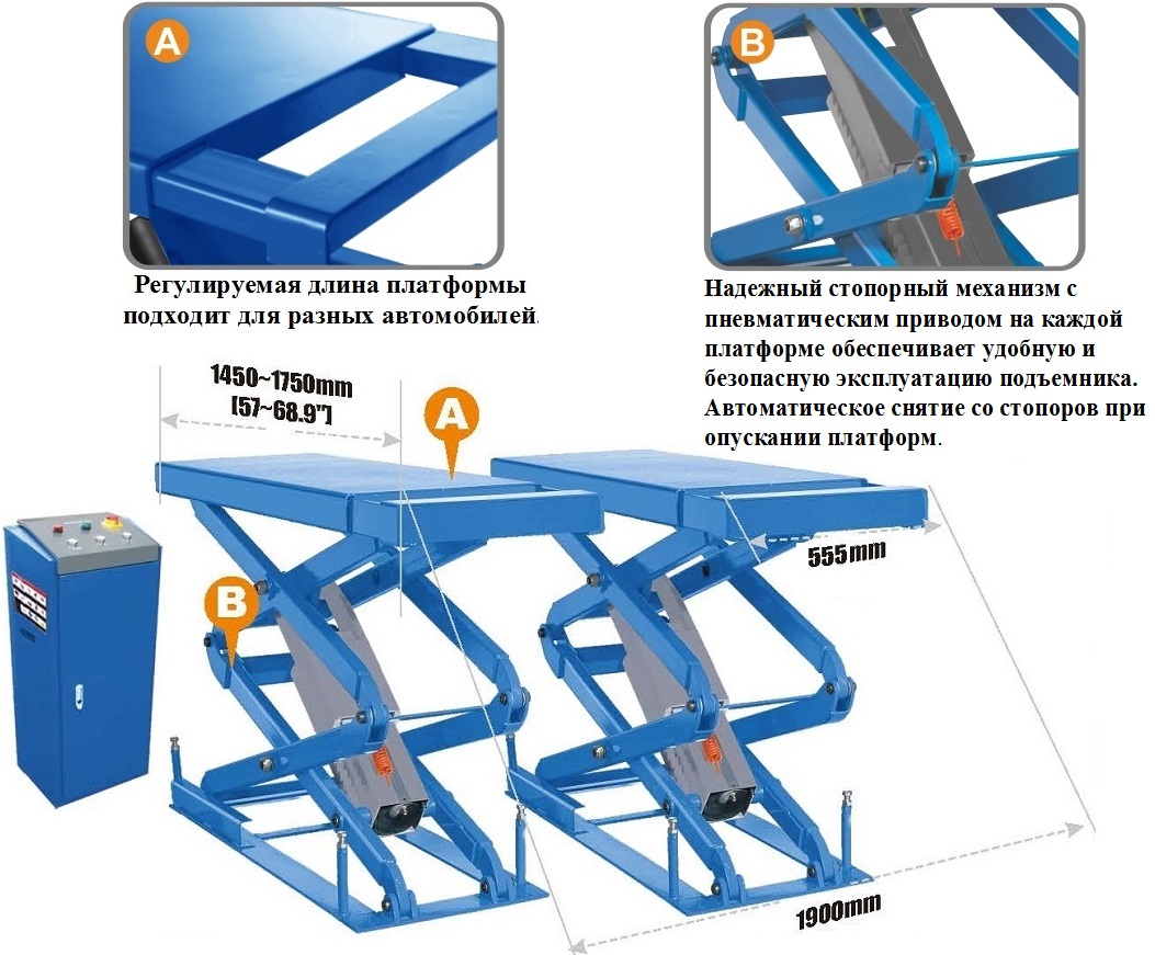 Подъемник ножничный электрогидравлический 3 тонны TS-1104 с заглублением (ровный пол), оборудован пневматическим стопорным механизмом – требуется подключение к пневмолинии. Стойка управления подъемником расположена отдельно. Поставляется на 220/380В